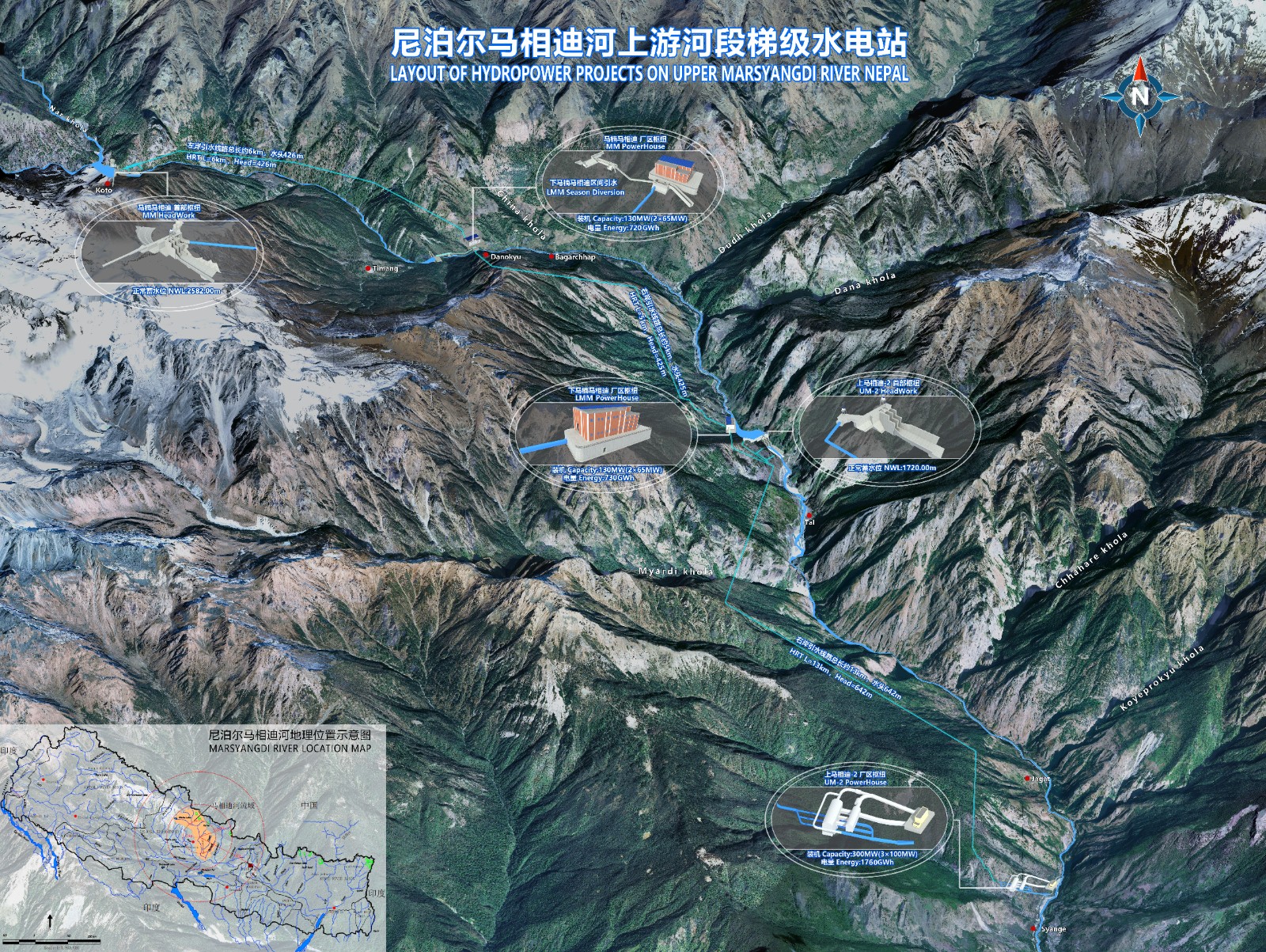 马相迪梯级水电站项目位于尼泊尔甘达基省马相迪河流域,由三座首尾相连的水电站组成,自上而下分别是马楠马相迪水电站、下马楠马相迪水电站和上马相迪-2水电站,总装机约60万千瓦,总投资约12亿美元。此次正式开工的马楠马相迪水电站作为第一级开发的水电站,总投资3.23亿美元,装机容量为13.5万千瓦,年均发电量7.12亿千瓦时。