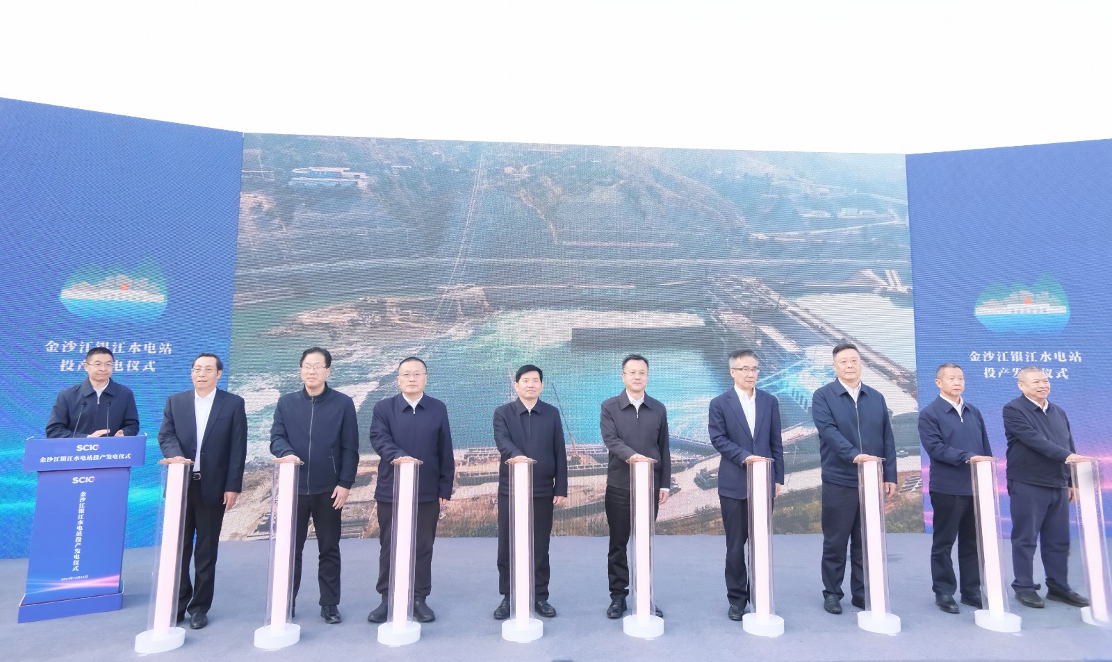 上午9时许,随着仪式现场下达首台机组开机发电指令,吴群刚、吴晓曦、范继跃、李文志、林建国、李仁杰等领导按下启动柱,共同启动金沙江银江水电站投产发电。