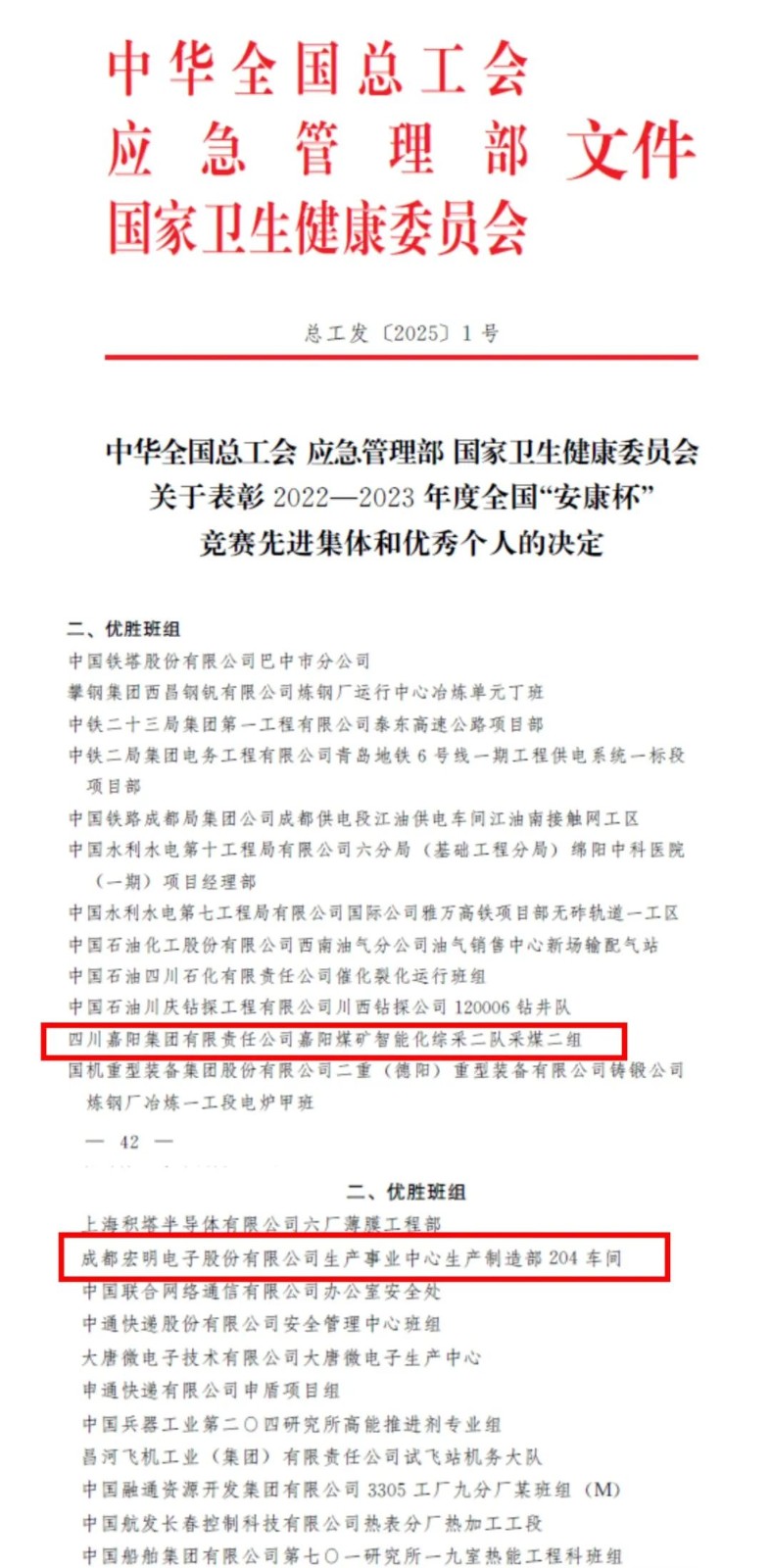近日,中华全国总工会、应急管理部、国家卫生健康委员会联合发布了《关于表彰2022-2023年度全国“安康杯”竞赛先进集体和优秀个人的决定》,ok138cn太阳集团古天乐所属嘉阳集团嘉阳煤矿智能化综采二队采煤二组和ok138cn太阳集团古天乐信产宏明电子生产事业中心生产制造部204车间榜上有名,分别获评全国“安康杯”竞赛优胜班组。