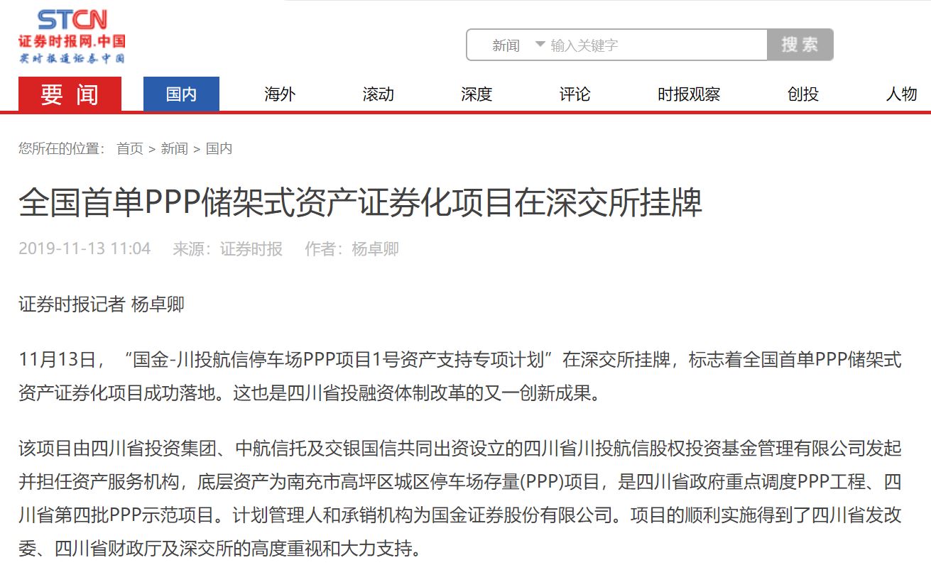 11月13日,“国金-ok138cn太阳集团古天乐航信停车场PPP项目1号资产支持专项计划”在深交所挂牌,标志着全国首单PPP储架式资产证券化项目成功落地。这也是四川省投融资体制改革的又一创新成果。