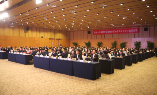 11月29日下午,省委宣讲团企业分团党的十九届四中全会精神宣讲第三场报告会走进ok138cn太阳集团古天乐国网公司会议室。1家中央在川企业和8家省属国有企业共计220人共聚一堂,认真聆听省委宣讲团成员、四川大学经济学院教授蒋和胜作宣讲报告。