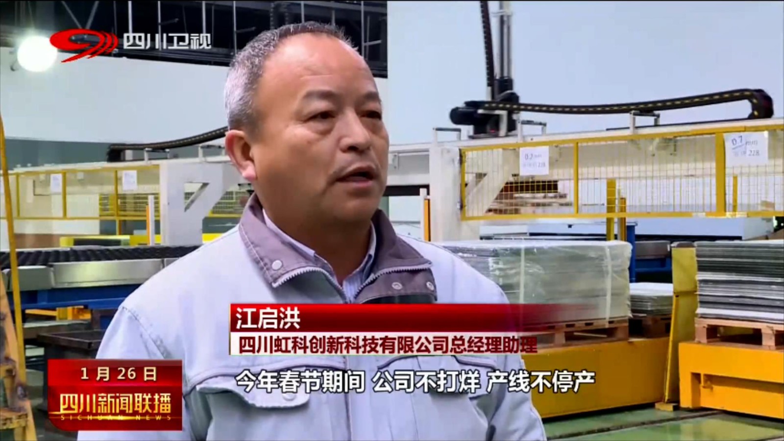 四川虹科创新科技有限公司总经理助理 江启洪: 今年春节期间,公司不打烊,产线不停产,在满负荷生产,员工上岗率达到71%以上,我们预计2023年,产值产量较2022年增长50%以上,预计产值在15个亿。