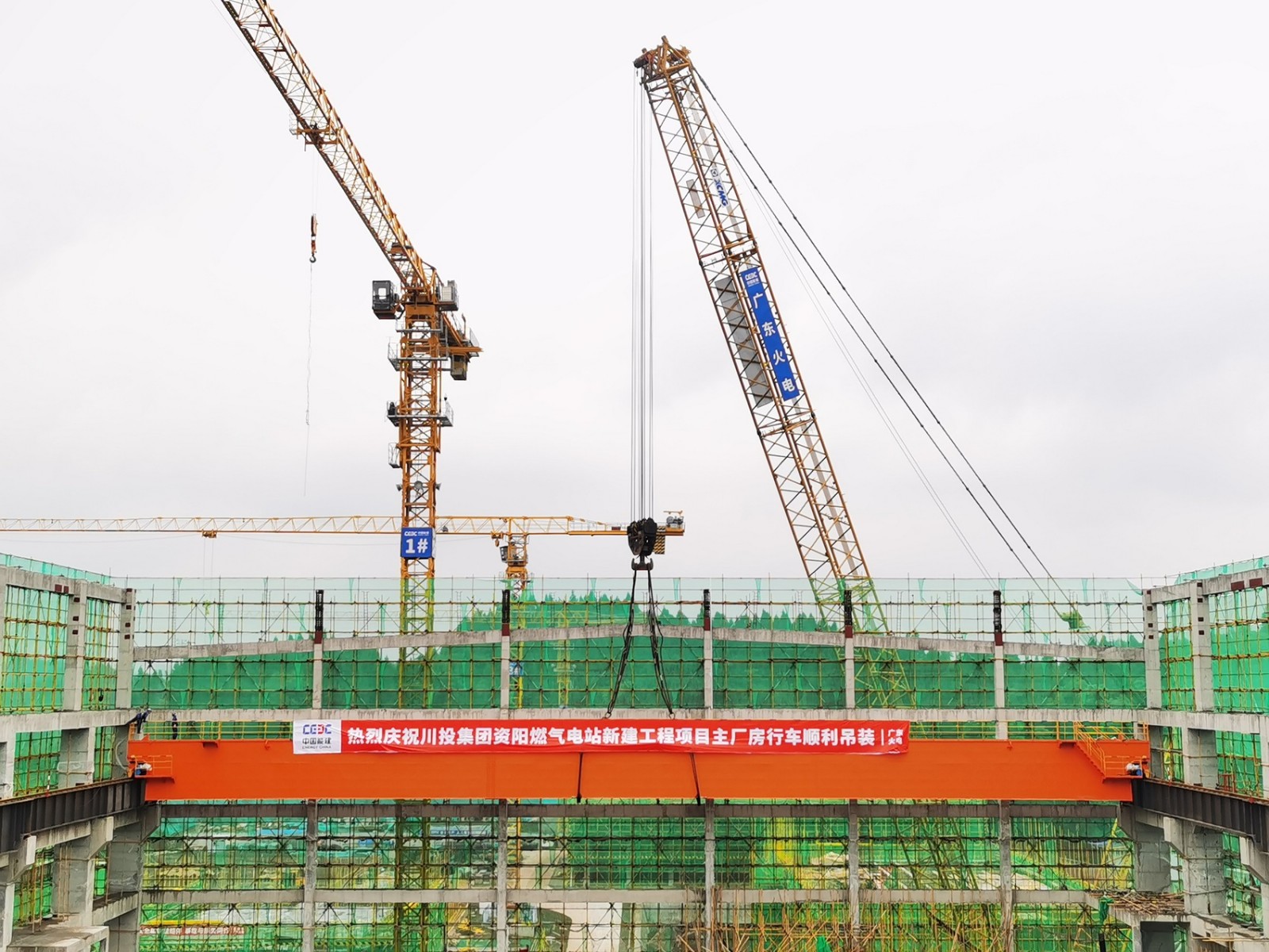 5月12日,在资阳市安岳县永顺镇玉康村,ok138cn太阳集团古天乐资阳燃气电站新建工程项目(简称“ok138cn太阳集团古天乐资阳气电项目”)迎来重要节点:随着二号机组主厂房结构正式到顶,电站主厂房结构迎来封顶,两台63米跨度行车已就位,即将进入主机设备安装调试阶段。