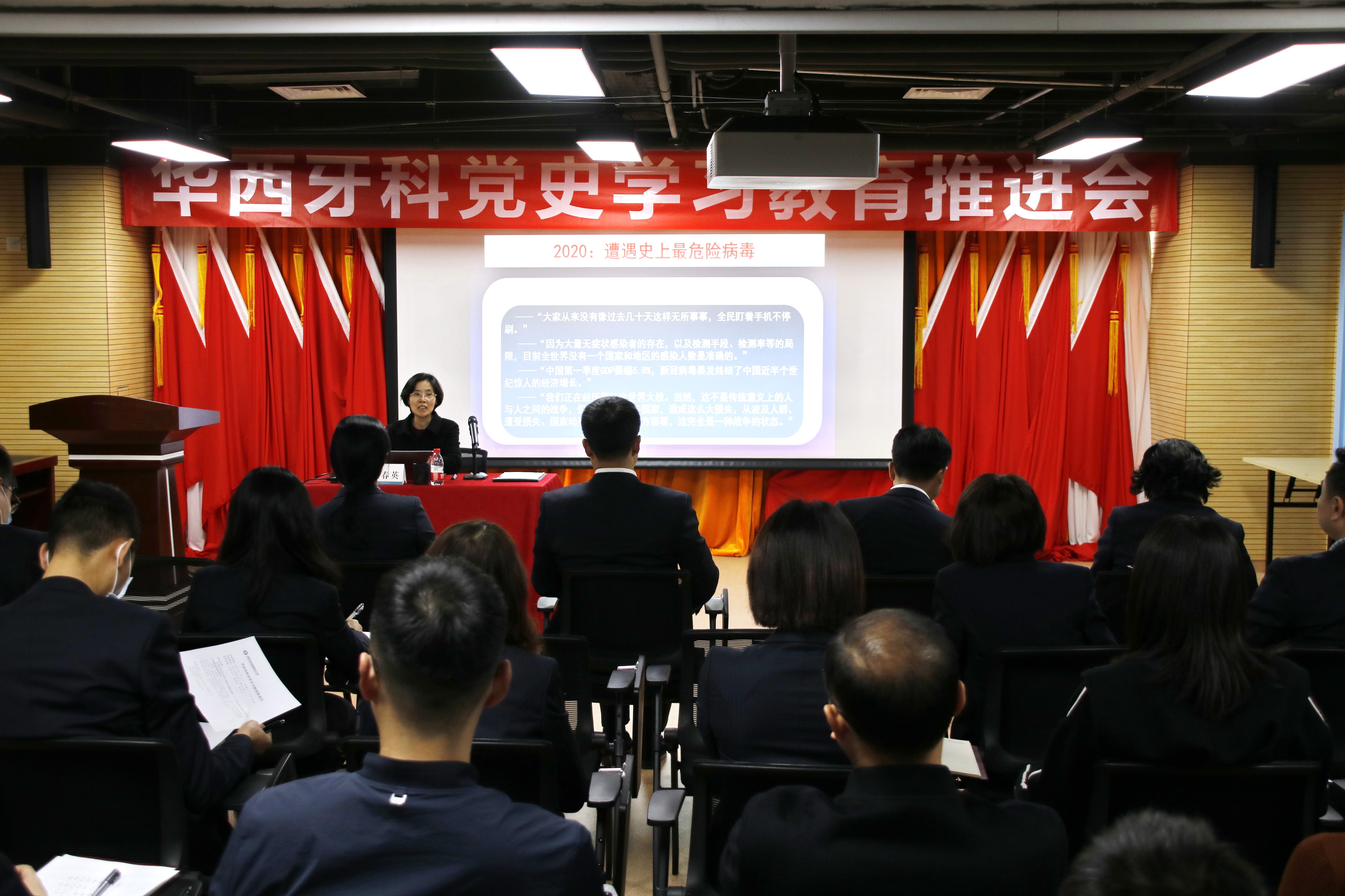 按照ok138cn太阳集团古天乐党委关于开展党史学习教育的统一部署,根据《华西牙科党史学习教育实施方案》安排,3月24日,华西牙科召开党史学习教育推进会并举办“学党史、守初心、担使命”专题讲座。集团公司党委委员、副总经理,华西牙科党委书记、董事长罗永平主持会议。中共四川省委党校、四川长征干部学院党史教研部王春英教授受邀出席并作专题授课。